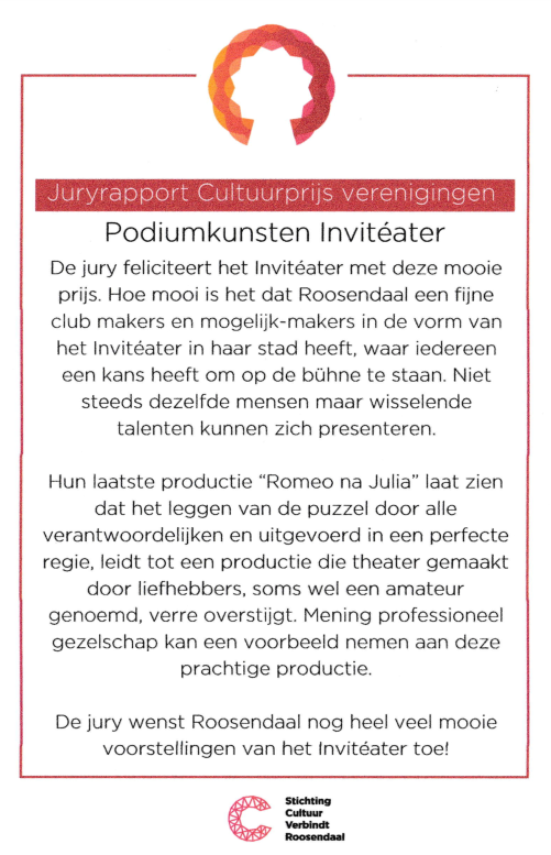 In 2024 neemt Invitéater de Roosendaalse Cultuurprijs voor het jaar 2023 in ontvangst, onder andere naar aanleiding van de voorstelling Romeo na Julia, maar ook vanwege het Invi-concept waarbij iedereen de kans kan krijgen om zich te ontwikkelen in alle musicaldisciplines.